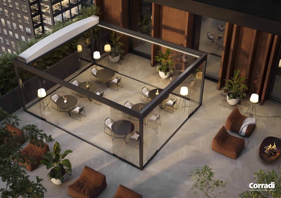 Corradi ha messo a punto un prodotto innovativo per l'outdoor living: Butterfly, la copertura con telo impacchettabile a pantografo.