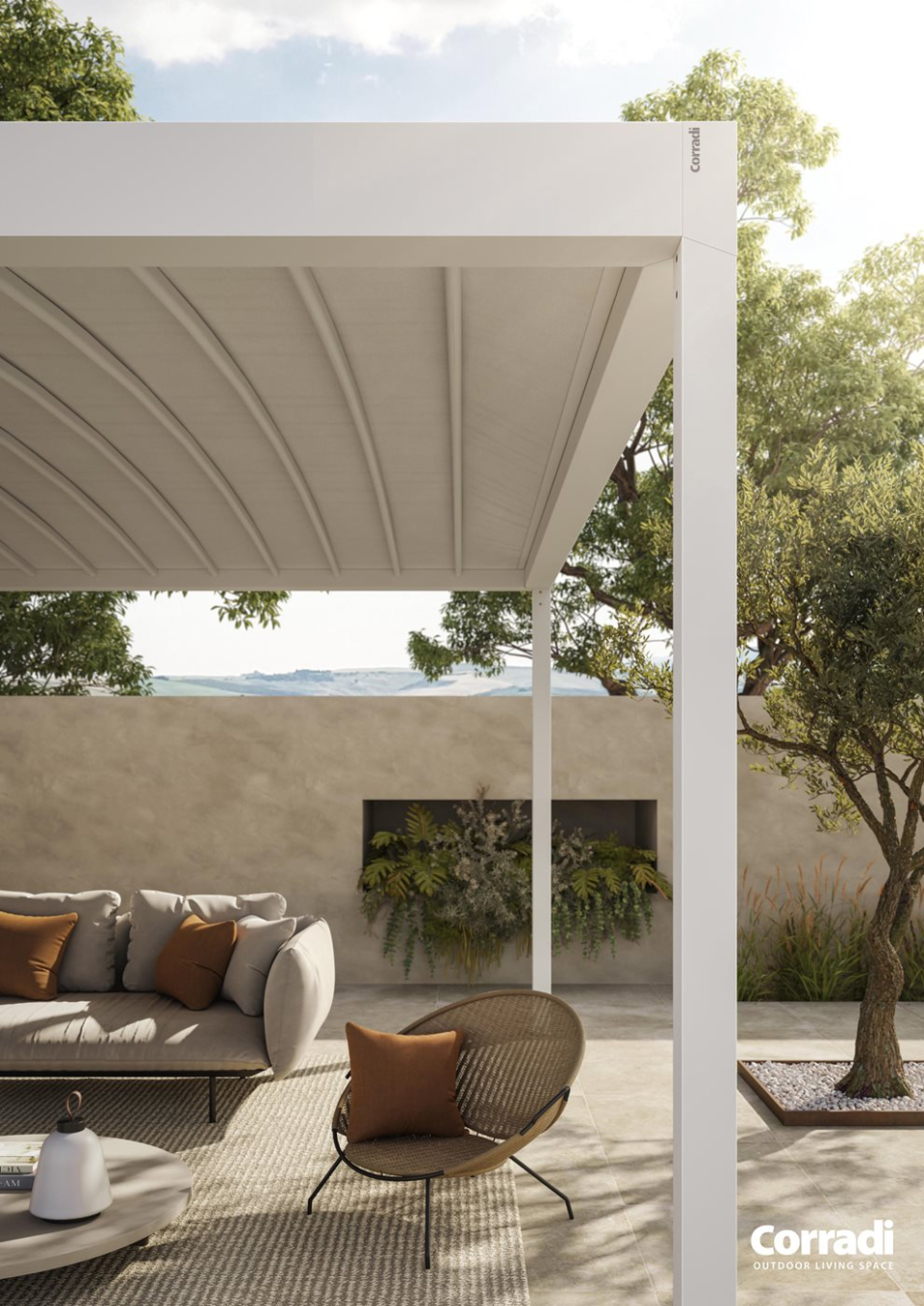 Corradi ha messo a punto un prodotto innovativo per l'outdoor living: Butterfly, la copertura con telo impacchettabile a pantografo, con il quale viene "capovolta" l'idea di pergola con telo. Il nuovo sistema presenta aste in alluminio a supporto dei tubi del telo, in modo da lasciar ripiegare il tessuto verso l'alto, una scelta strategica di design.