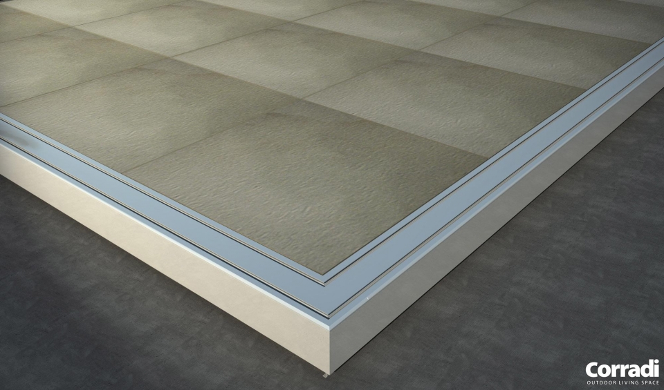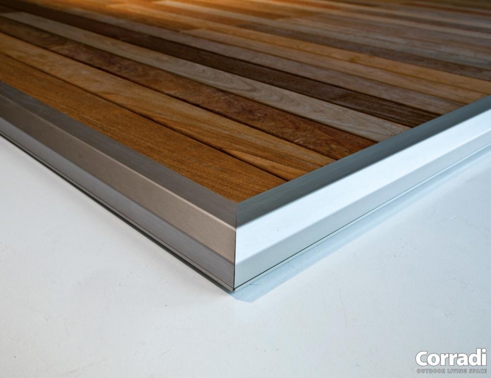 La doppia cornice perimetrale regolabile è in alluminio e il piano di calpestio è realizzabile in legno Ipè o ceramica.