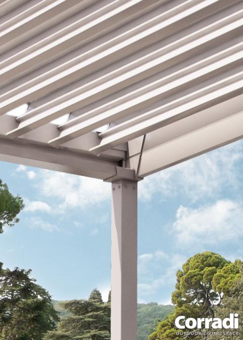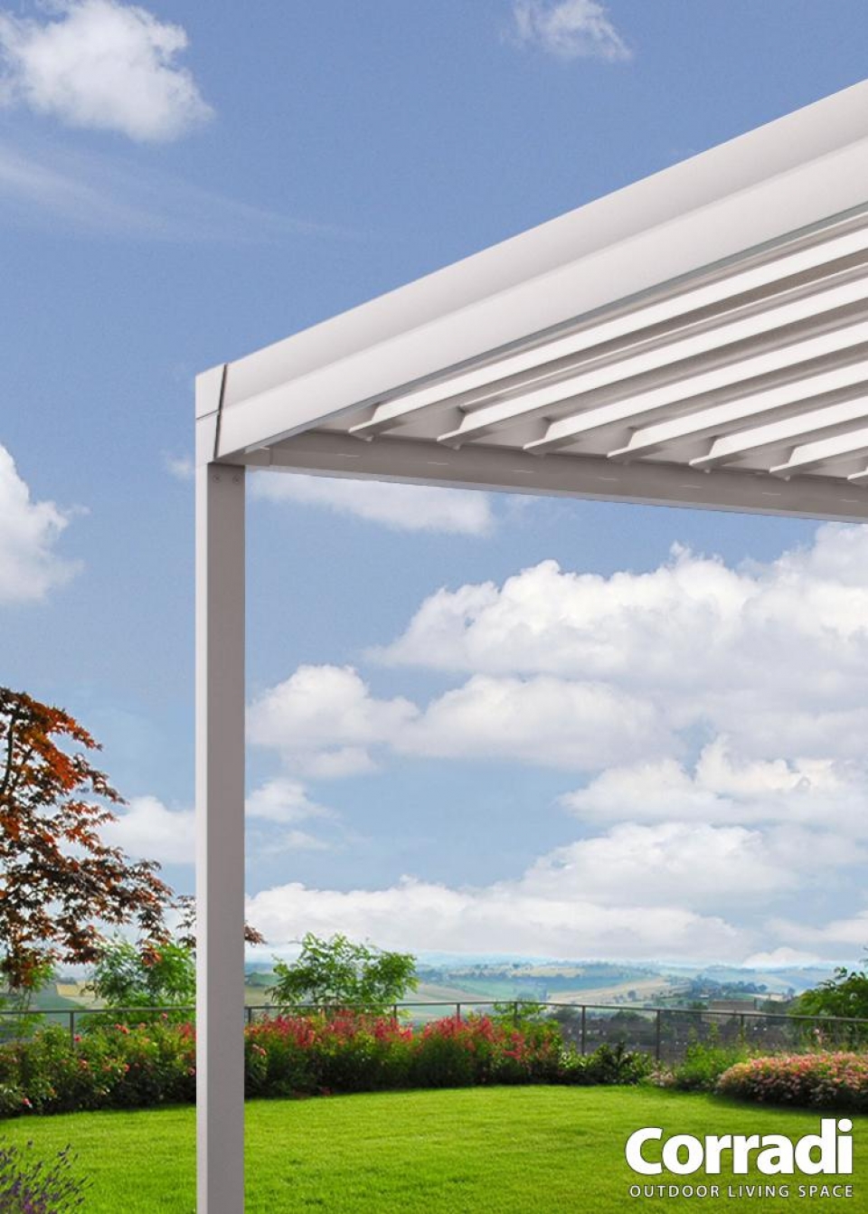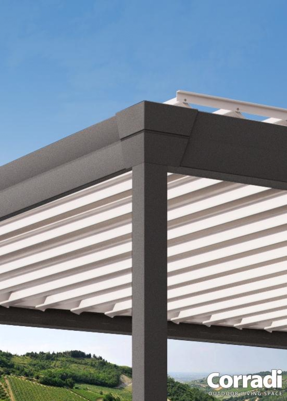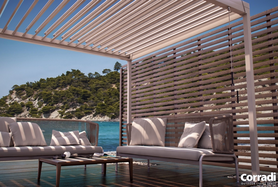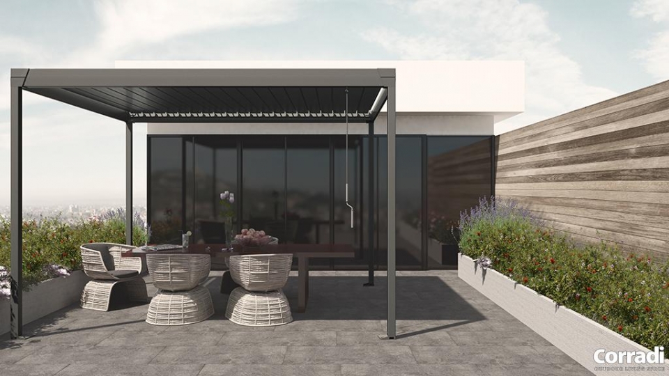 La Pergola Eteria di Corradi è un modello manuale di pergola bioclimatica Corradi, con tetto a lamelle piane orientabili fino a 120° senza necessità di elettricità per la movimentazione.