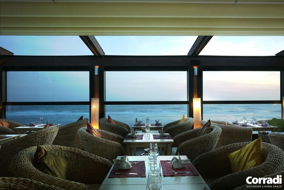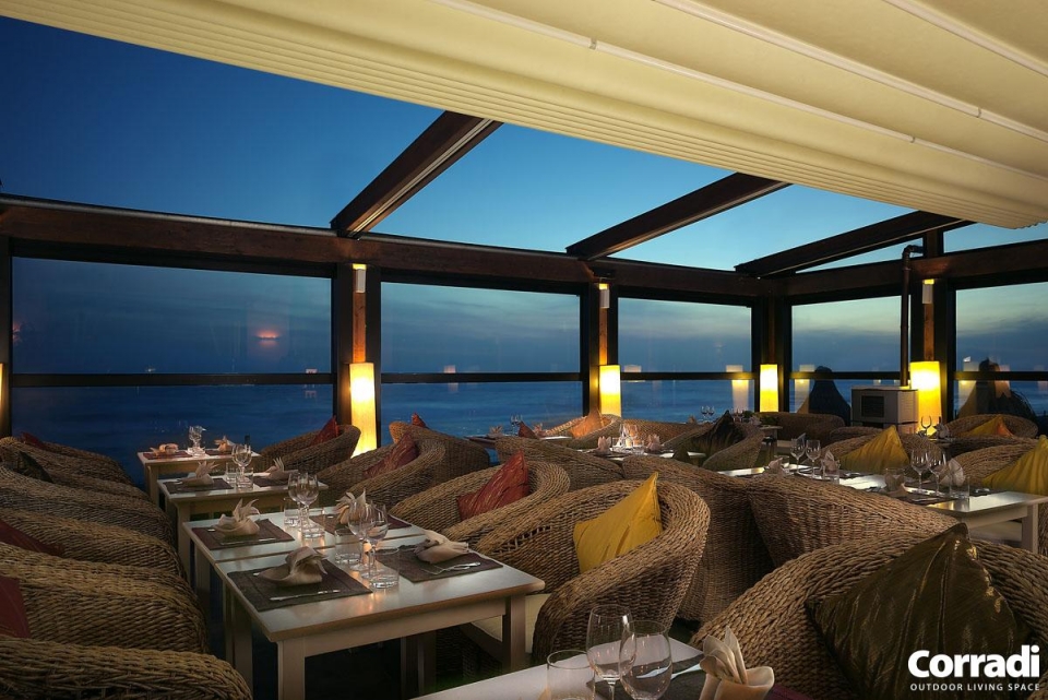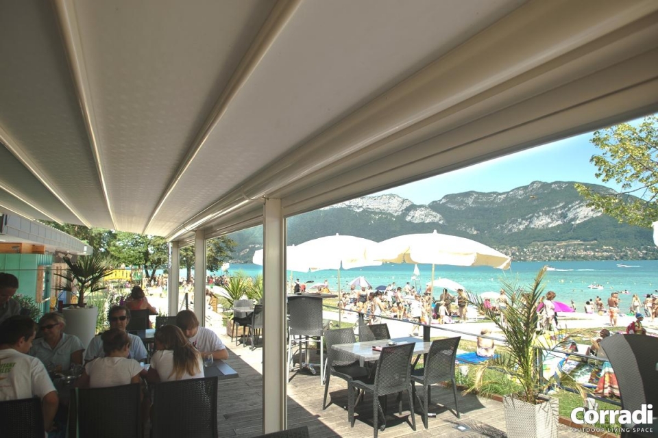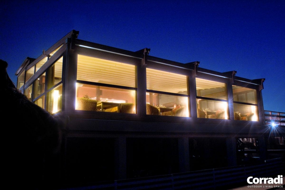 PT 45 è un sistema di copertura mobile progettato appositamente per la protezione da sole e pioggia, ma non è adatto a supportare un eventuale carico di neve. Il sistema PT è autoportante modulare, costituito da una struttura in legno lamellare e da un telo guidato da un sistema di chiusura ad impacchettamento.