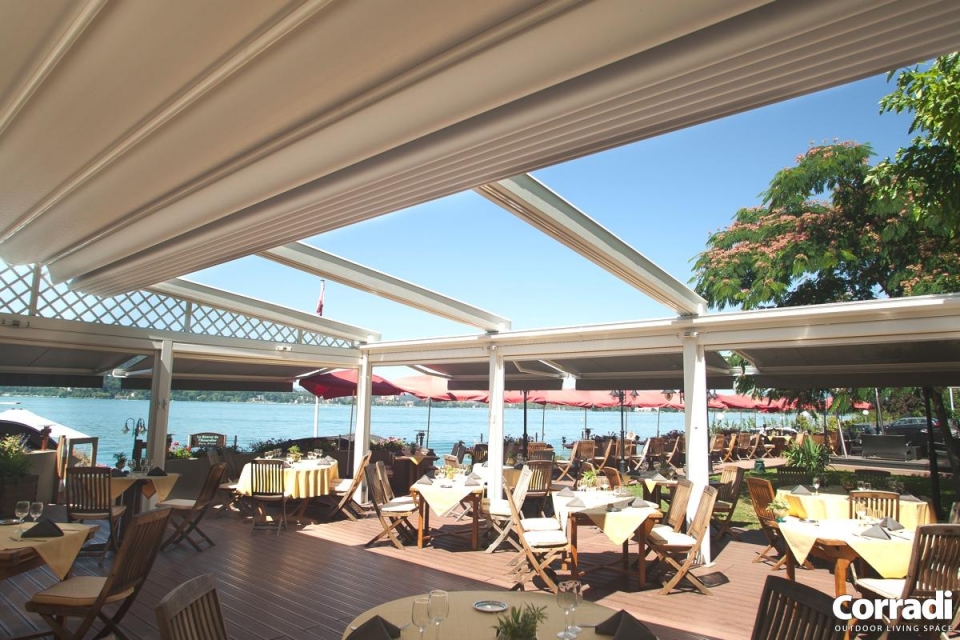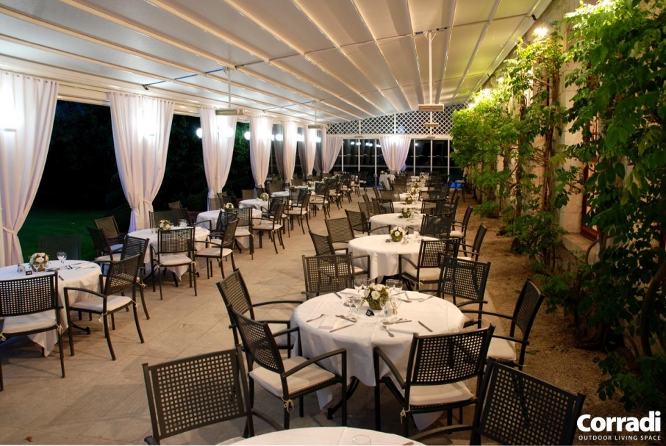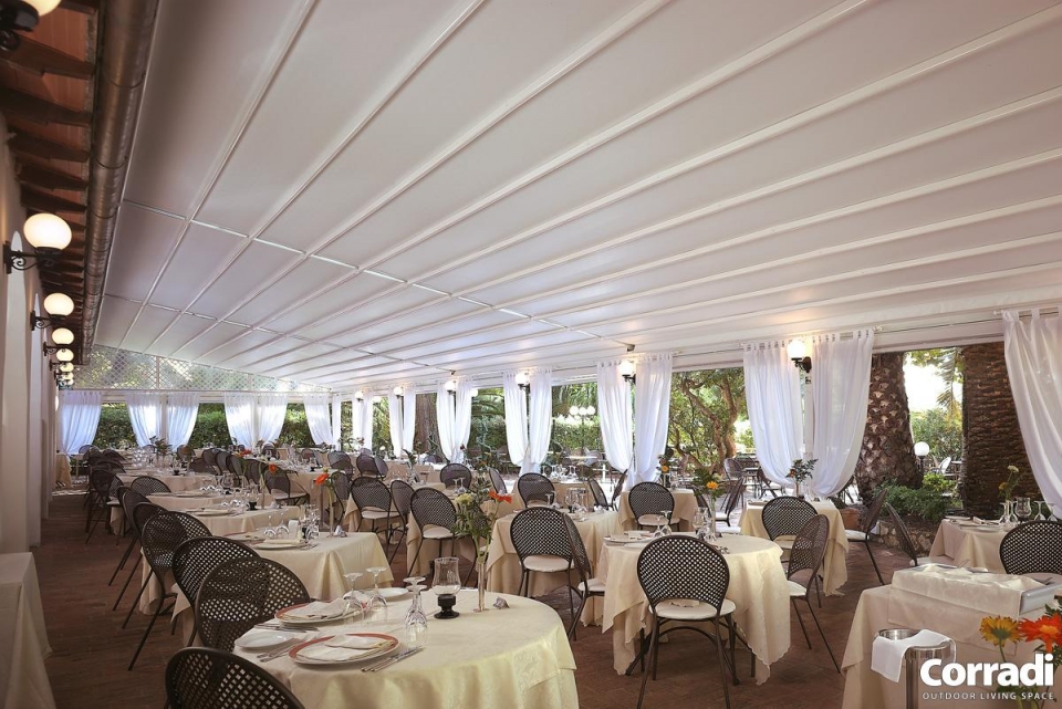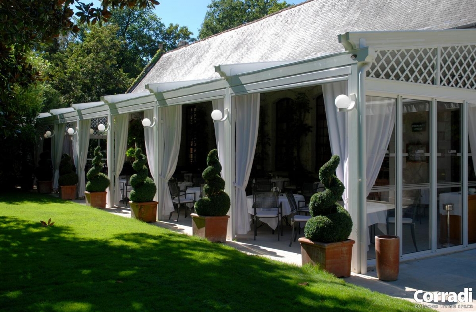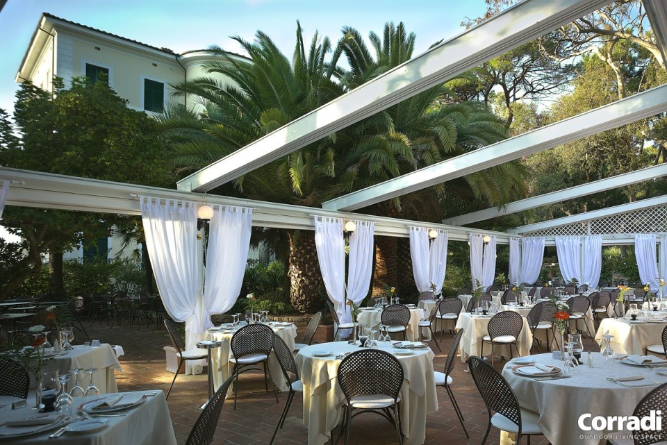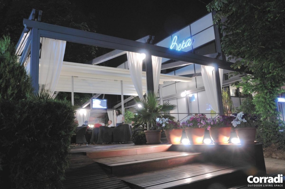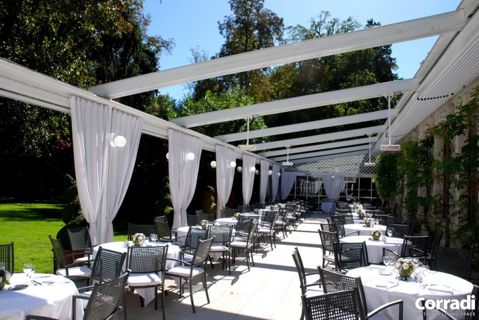 Pergotenda® PT 60 è la classica Pergotenda® Corradi in legno addossata a parete, in grado di ombreggiare ampie superfici creando un unico ambiente tra indoor e outdoor. Proprio per queste caratteristiche, Pergotenda® PT60 è molto indicata per grandi spazi di ristoranti, bar, hotel.