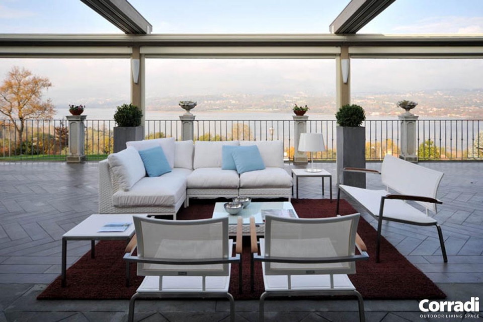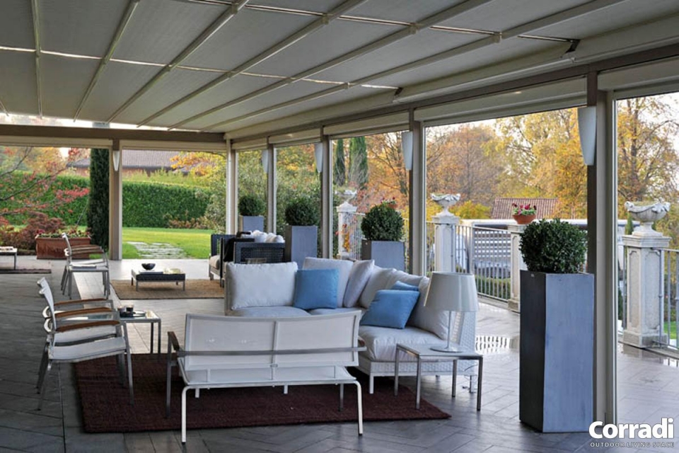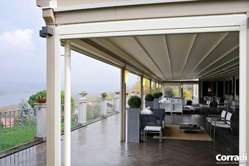 PT 60 è un sistema di copertura mobile realizzato su misura per proteggere gli ambienti esterni da sole e pioggia (non è idoneo al carico di neve). Il sistema PT è autoportante modulare, con una struttura in legno lamellare ed un telo che si chiude tramite un meccanismo ad impacchettamento.