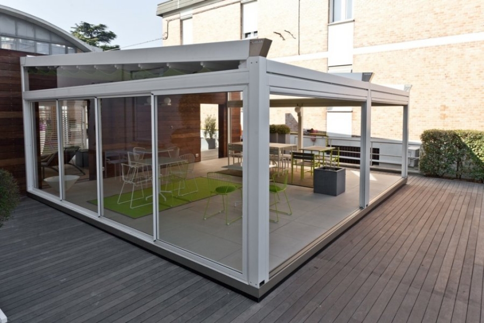 Può essere completata con un sistema di chiusure perimetrali e con un impianto brevettato di riscaldamento per prolungare l'utilizzo degli spazi esterni di locali ed edifici pubblici.