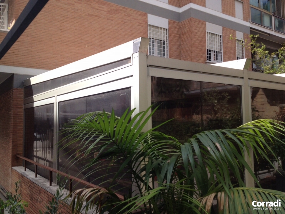 Una Pergotenda® Corradi pensata per entrare in sintonia con il design moderno degli edifici urbani e creare uno spazio outdoor confortevole in tutte le stagioni dell'anno. Ideale per grandi locali pubblici, ambienti business, aeroporti, stazioni o zone industriali, la Pergotenda B-Space è un prodotto dalle caratteristiche tecniche di alto livello in grado di coprire anche spazi di grandi dimensioni. Dotata di un'elevata solidità strutturale, può ricoprire superfici di lunghezza fino a 9 metri, ma nelle misure più piccole può essere utilizzata anche per giardini e terrazzi privati, a cui conferirà un inconfondibile stile minimal e moderno.