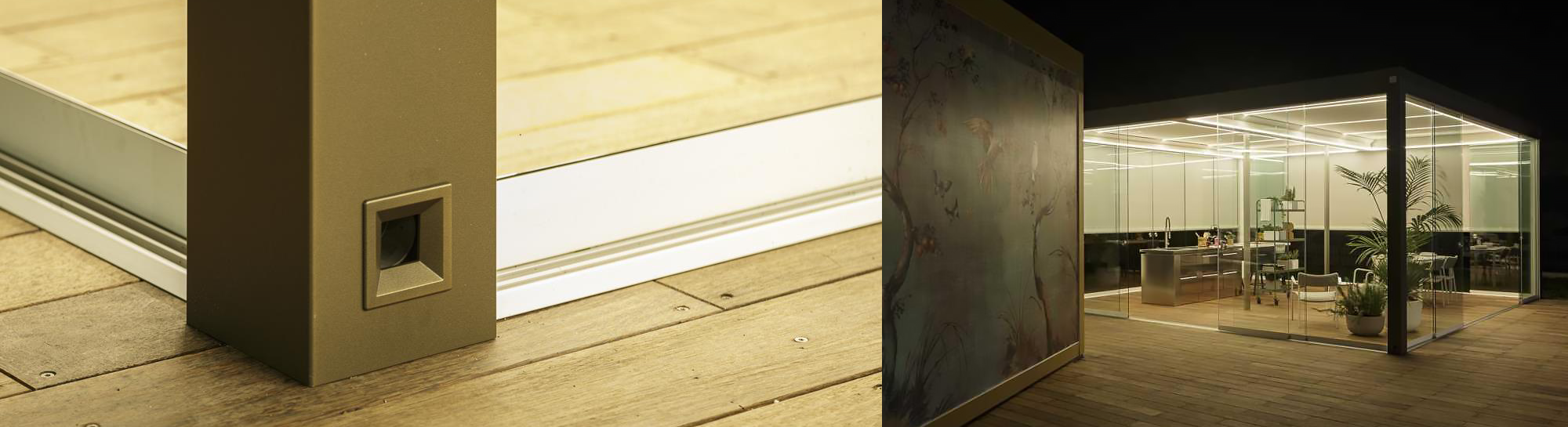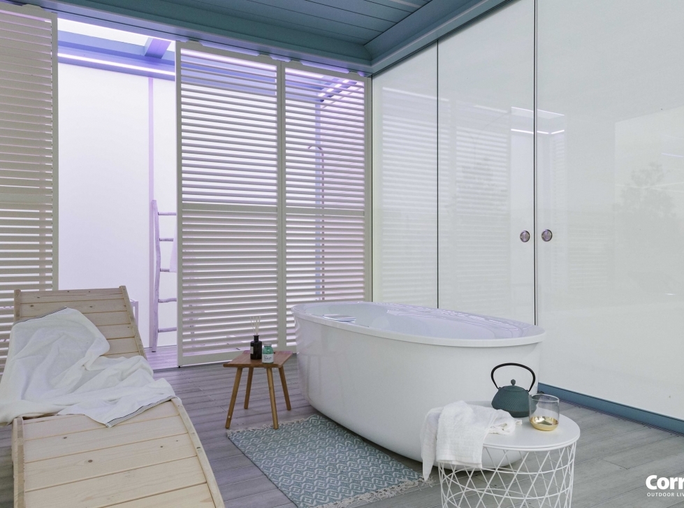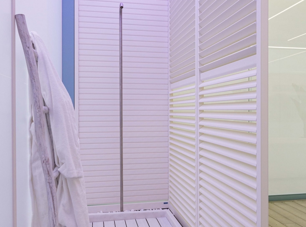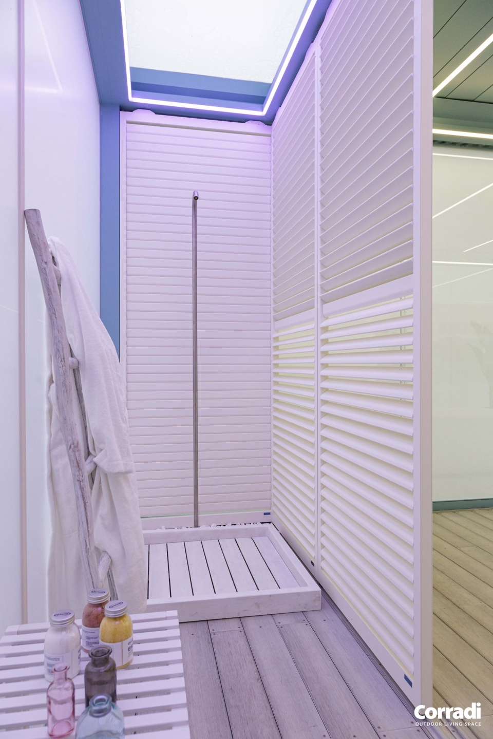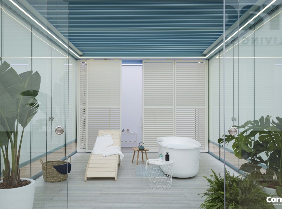 All’interno di Imago lo spazio è modulabile a seconda della funzione desiderata: si può realizzare un locale guardaroba, ripartendo i pannelli brise soleil fissi e scorrevoli, fissati a una trave aggiuntiva, tutto grazie al modulo Closet. Imago può così diventare un padiglione autosufficiente con pedana innovativa alta 17,5 cm e con la possibilità di compensare i dislivelli abbinando diverse pavimentazioni calpestabili. Il modello è disponibile anche senza pedana, con sistemi di scarico su tutti i lati.