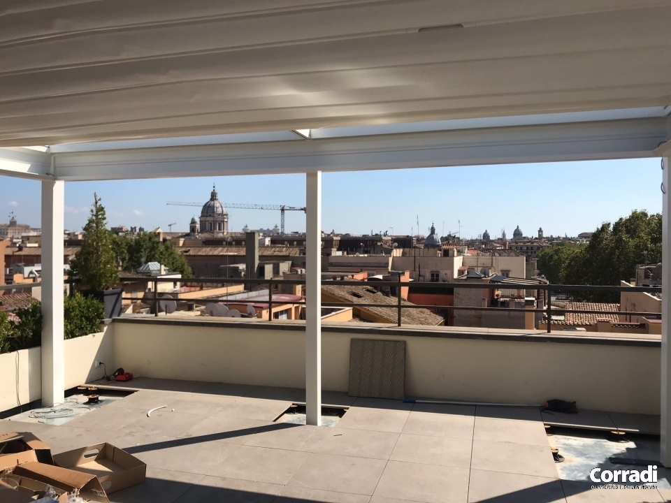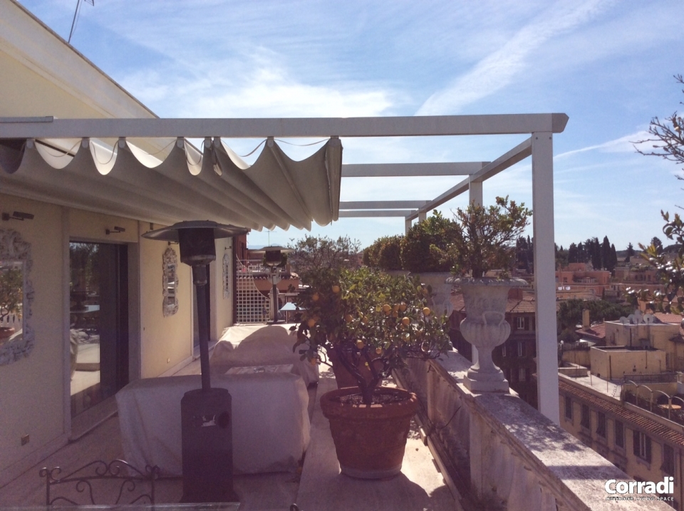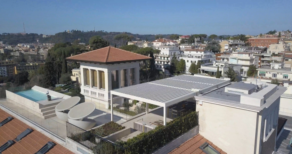 Centro Italia ha realizzato su un lussuoso attico di Roma un progetto outdoor che include anche una grande pergola bioclimatica. Con questa Pergotenda è possibile sfruttare lo spazio esterno tutto l'anno, anche con pioggia o sole.