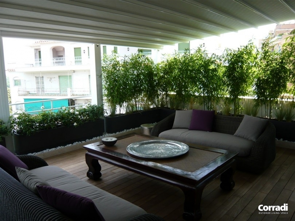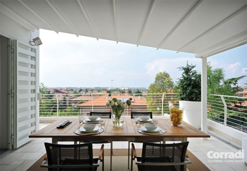 Nei terrazzi troppo esposti, l'installazione di una Pergotenda® per l'inverno o di una pergola bioclimatica risolve anche il problema degli agenti climatici esterni (pioggia e sole), che spesso impediscono di sfruttare l'outdoor nei mesi invernali o in piena stagione estiva. Il design elegante delle pergole Corradi va ad arricchire lo spazio mantenendo la continuità e l'armonia architettonica con l'edifico. La pergola Corradi rappresenta la soluzione ideale per chiunque voglia godersi il proprio terrazzo tutto l'anno.