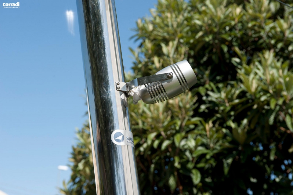 Illuminazione: la vela Scirocco è dotata di vari faretti a led in funzione del numero dei pali e delle staffe. I faretti sono applicati con staffa inclinabile. Questo montaggio permette l'orientamento della luminosità a seconda dei punti da illuminare. Ogni faretto in alluminio anodizzato argento contiene una lampada a Led di 8,3 W - 220V - luce naturale 4000°K.