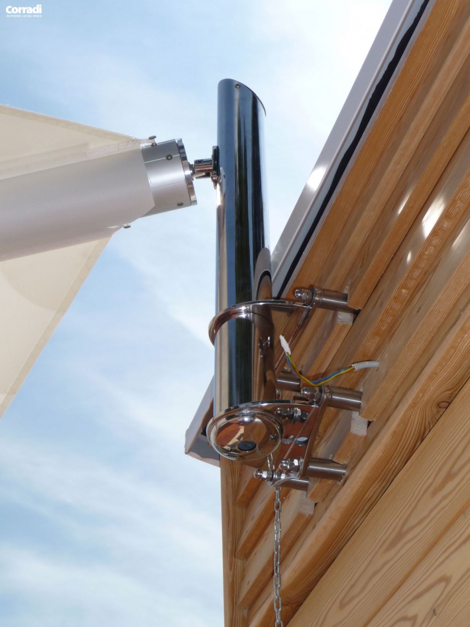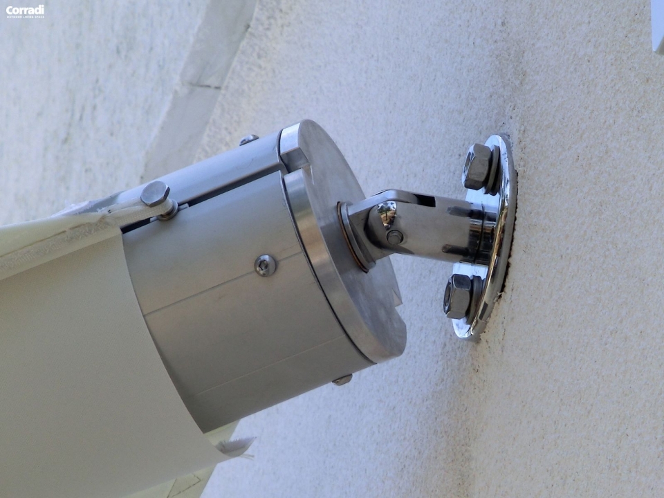 Struttura: in acciaio inox 304 nautico lucidato personalizzabile. La struttura è composta da vari pali in funzione della figura da ottenere. Il motoriduttore è centrale e può essere fissato tra due pali, tra palo e parete o tra palo e soffitto. Il sistema di riavvolgimento è automatico con telecomando. I Pali possono essere forniti in versione satinata o lucida (elettrolucidata).